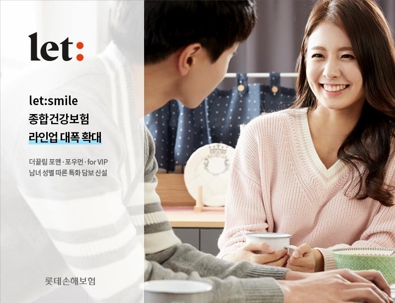(서울=연합뉴스) 이지헌 기자 = 롯데손해보험[000400]은 성별 특화 보장을 강화하는 방향으로 주력 상품인 '렛:스마일(let:smile)' 종합건강보험의 상품군을 대폭 늘렸다고 18일 밝혔다.