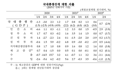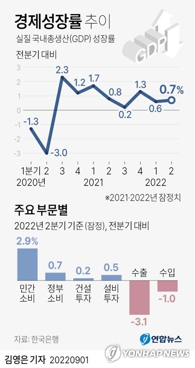 (서울=연합뉴스) 신호경 기자 = 사회적 거리두기 해제로 민간 소비가 늘어나면서 2분기(4∼6월) 한국 경제가 0.7% 성장했다.