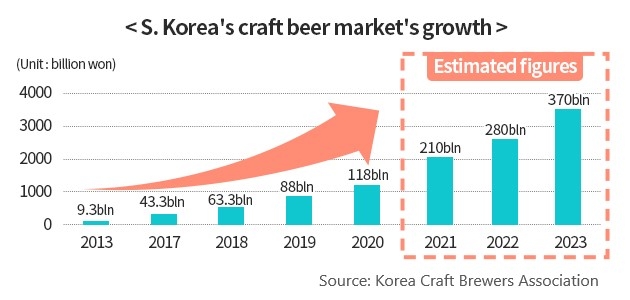Craft breweries' share of the country's 5 trillion-won (US$4.2 billion) beer market rose to more than 2 percent in 2020 from less than 1 percent a year earlier, the KCBA said.