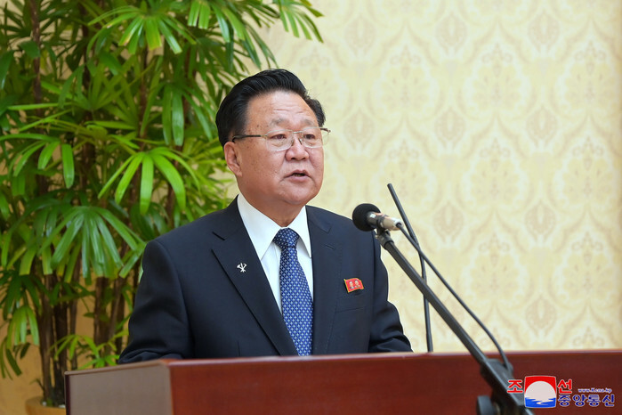 Choe Ryong-hae, chairman of the standing committee of North Korea's Supreme People's Assembly, speaks during a banquet for his Chinese counterpart, Zhao Leji, at the Mansudae Assembly Hall in Pyongyang on April 11, 2024, in this photo released by the North's Korean Central News Agency the subsequent day. Zhao visited Pyongyang at the North's invitation to celebrate the 75th anniversary of diplomatic ties between the two nations. (For Use Only in the Republic of Korea. No Redistribution) (Yonhap)