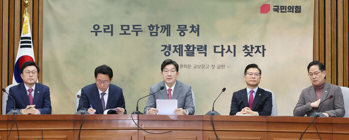 Kweon Seong-dong (C), floor leader of the ruling People Power Party, speaks during a meeting of the party at the National Assembly in Seoul on March 14, 2025. (Yonhap)