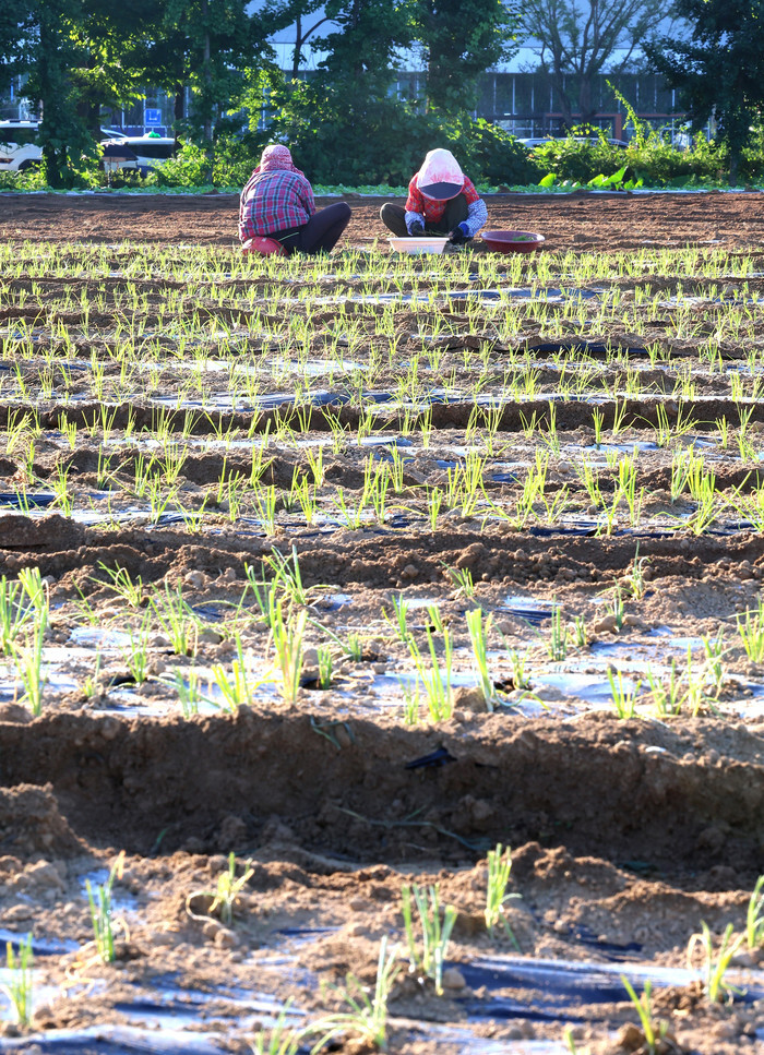 Farmers plant scallions at a farm in Incheon, west of Seoul, in the early morning of Sept. 11, 2025, amid refreshing weather. (Yonhap)