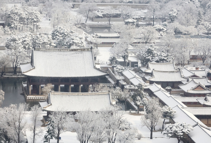 This photo, taken March 18, 2025, shows Gyeongbok Palace, the main royal palace during the 1392-1910 Joseon Dynasty, covered with snow in Seoul amid an unseasonably heavy snow advisory issued for the capital. (Yonhap)
