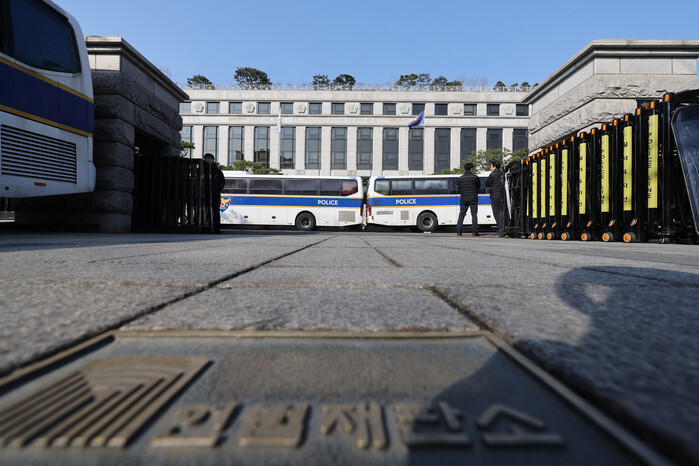 Police officers stand guard at the Constitutional Court in Seoul on March 31, 2025, as the court has yet to set a date for handing down a decision on whether to remove impeached President Yoon Suk Yeol from office or reinstate him over his brief imposition of martial law in early December. (Yonhap)