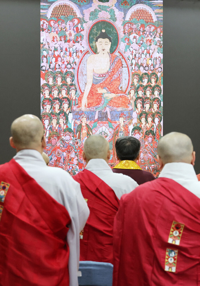 Buddhist monks from the Jogye Order, South Korea's largest Buddhist sect, sing a hymn during a ritual involving a group of Buddhist lawmakers, known as Jeonggakhoe, for New Year at the parliamentary building in Seoul on March 5, 2025. (Yonhap)