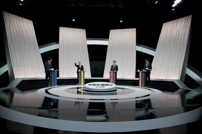 Four presidential candidates -- (from L to R) Lee Jae-myung of the Democratic Party, Kwon Young-kook of the minor Democratic Labor Party, Kim Moon-soo of the People Power Party and Lee Jun-seok of the minor New Reform Party -- prepare to attend their last televised debate, hosted by the MBC TV network, in Seoul on May 27, 2025, ahead of the June 3 presidential election. (Pool photo) (Yonhap)
