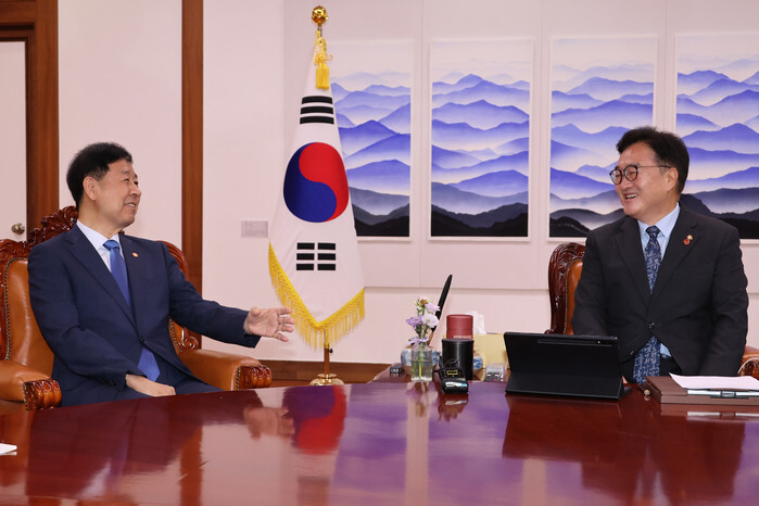 Finance Minister Koo Yun-cheol (L), who serves concurrently as deputy prime minister for economic affairs, talks with National Assembly Speaker Woo Won-shik during their meeting at the parliamentary building in Seoul on Aug. 6, 2025. (Yonhap)