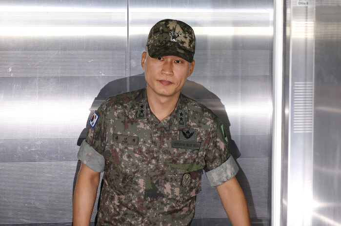 Park Jin-hee, a former aide to former Defense Minister Lee Jong-sup, rides in an elevator as he appears at the office of special counsel Lee Myeong-hyeon's team in Seoul on July 30, 2025, to be questioned for the second time over a series of allegations surrounding the death of a Marine, Chae Su-geun, in July 2023. (Yonhap)