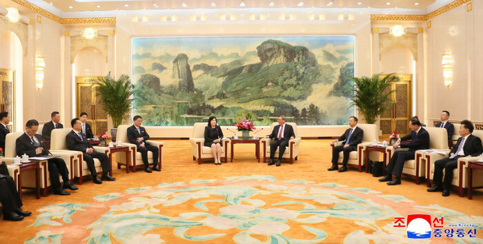 North Korean Foreign Minister Choe Son-hui (L, rear) holds talks with Chinese Premier Li Qiang (R, rear) during their meeting at the Great Hall of the People in Beijing on Sept. 29, 2025, in this photo taken from the website of the North's official Korean Central News Agency the next day. (For Use Only in the Republic of Korea. No Redistribution) (Yonhap)
