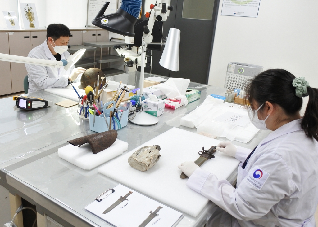(서울=연합뉴스) 박상현 기자 = 국립문화재연구원은 강원도 철원군 비무장지대(DMZ) 일대에서 수습된 한국전쟁 전사자 유품 368점을 보존처리한다고 24일 밝혔다.