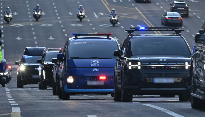 A Ministry of Justice vehicle (blue, 2nd from R) carrying arrested President Yoon Suk Yeol drives en route to the Seoul Central District Court in the capital on Feb. 20, 2025, as Yoon will attend the first hearing of his criminal trial on insurrection charges in connection with his short-lived imposition of martial law in December. (Yonhap)