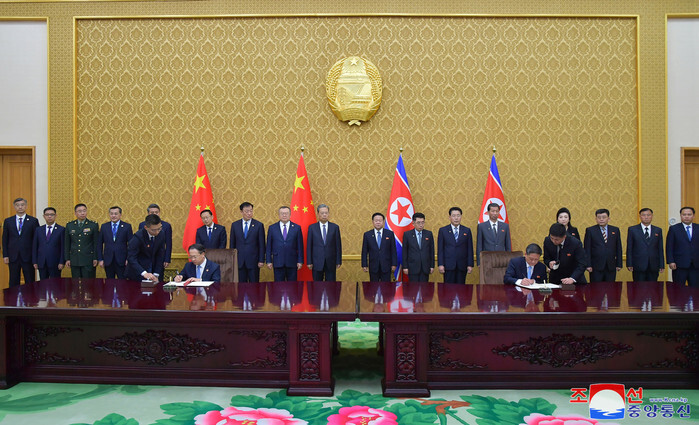 Talks between Choe Ryong-hae (8th from R), chairman of the standing committee of North Korea's Supreme People's Assembly, and his Chinese counterpart, Zhao Leji (9th from L), take place in Pyongyang on April 11, 2024, in this photo released by the North's Korean Central News Agency the subsequent day. Zhao visited Pyongyang at the North's invitation to celebrate the 75th anniversary of diplomatic ties between the two nations. (For Use Only in the Republic of Korea. No Redistribution) (Yonhap)