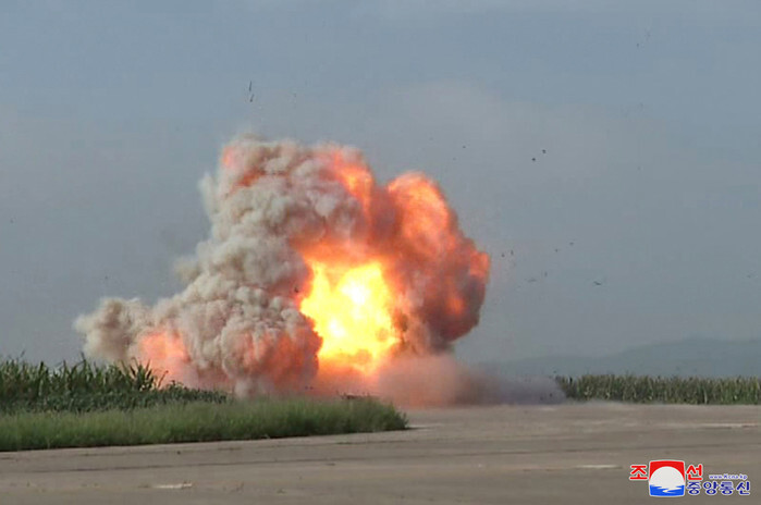 This image, provided by North Korea's official Korean Central News Agency, shows a recently developed drone destroying a target in a performance test at the Drone Institute of the Academy of Defence Sciences in Pyongyang during North Korean leader Kim Jong-un's visit on Aug. 24, 2024. (For Use Only in the Republic of Korea. No Redistribution) (Yonhap)