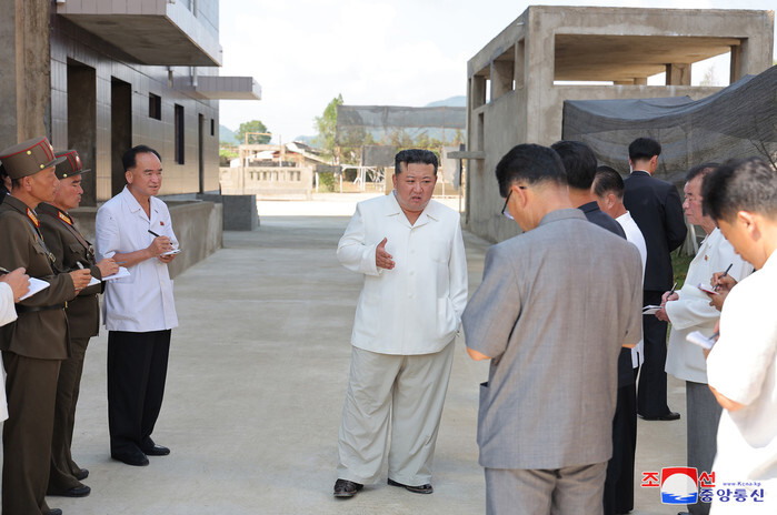 North Korean leader Kim Jong-un (C) visits a construction site for an industrial factory as part of his inspection of such sites conducted April 24-25, 2024, in this photo provided by the North's official Korean Central News Agency. (For Use Only in the Republic of Korea. No Redistribution) (Yonhap)