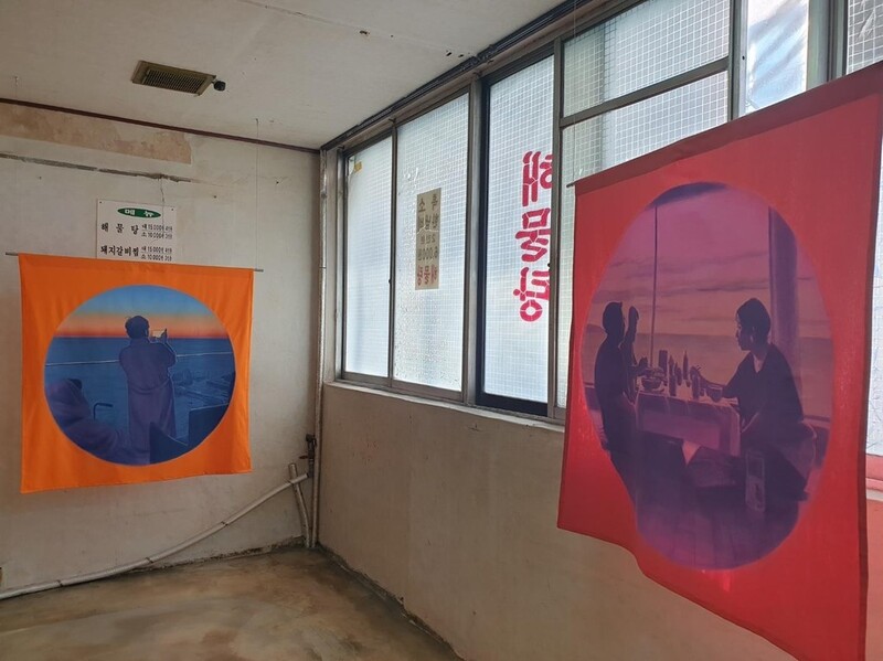 상인들이 반겨주는 동부시장 곳곳에도 여러 작가의 작품이 놓였다. 시장 내 한 건설사의 공사장 식당인 속칭 '함바집'으로 쓰였던 곳에는 이우성 작가의 걸개그림이 걸렸다. 가족이 함께 식사하는 모습을 담은 그림 옆 창문에는 과거 식당의 '해물탕' 글씨가 선명하게 남아있다.