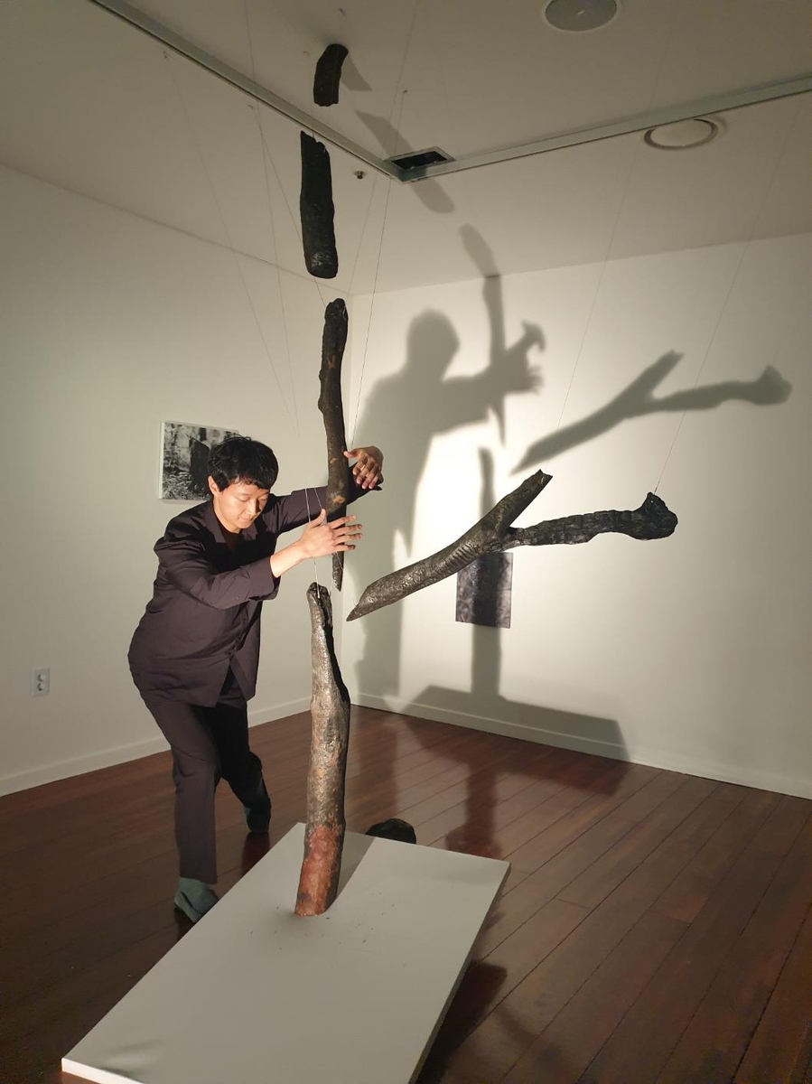 | ▲ (강릉=연합뉴스) 황희경 기자 = 임호경 작가가 작품 '탄소나무'와 함께 퍼포먼스를 하는 모습. 2023.9.29. zitrone@yna.co.kr |
