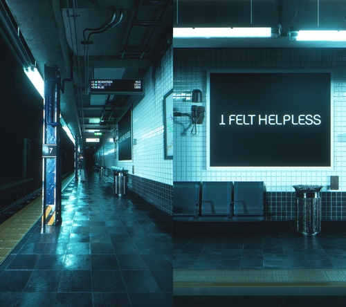 Set on a dark and bleak subway platform, the teaser features the enigmatic caption "I Felt Helpless" displayed on an electronic billboard, sparking curiosity about the concept behind the group's new release.