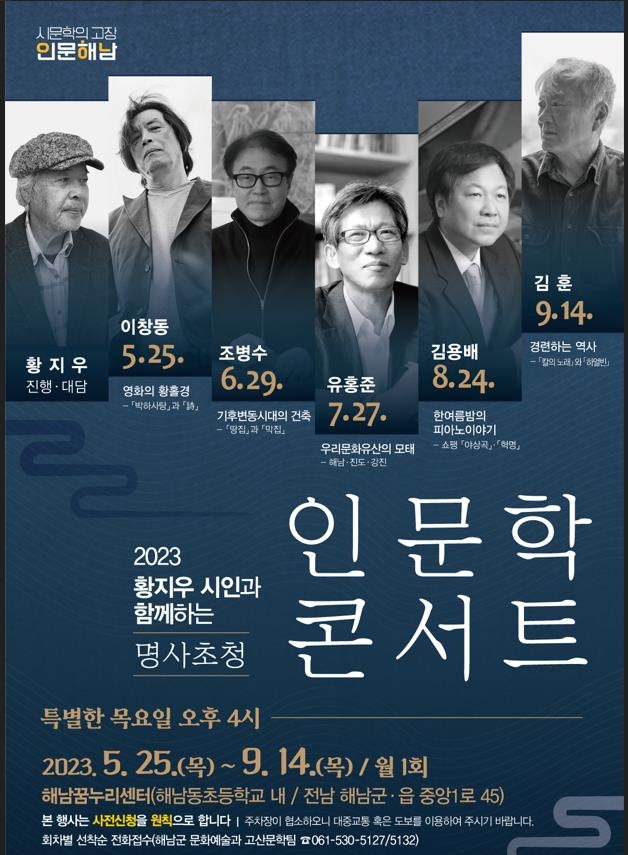 해남군은 5월부터 9월까지 매월 한차례 한국 인문학계를 대표하는 명사를 초청하는 '황지우 시인과 함께하는 명사초청 인문학 콘서트'를 개최한다.