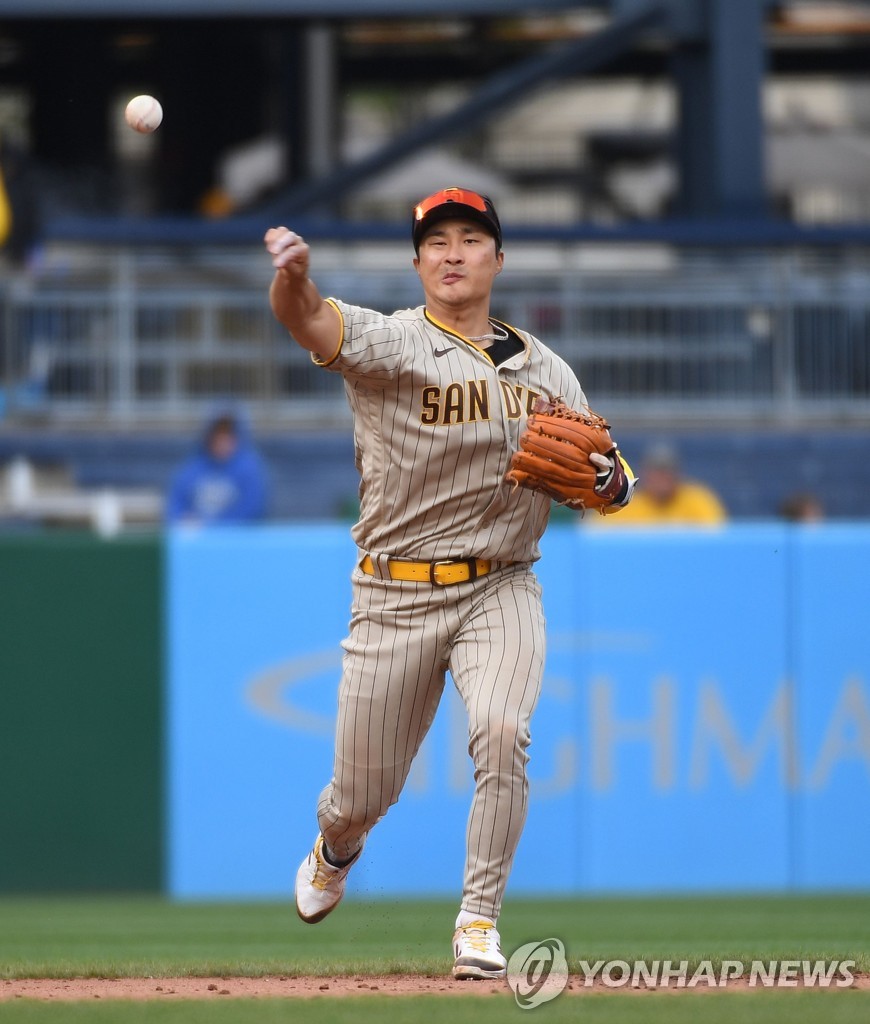| ▲ In this Getty Images photo, San Diego Padres' shortstop Kim Ha-seong throws to first base to retire Roberto Perez of the Pittsburgh Pirates during the bottom of the ninth inning of a Major League Baseball regular season game at PNC Park in Pittsburgh on May 1, 2022. (Yonhap) |