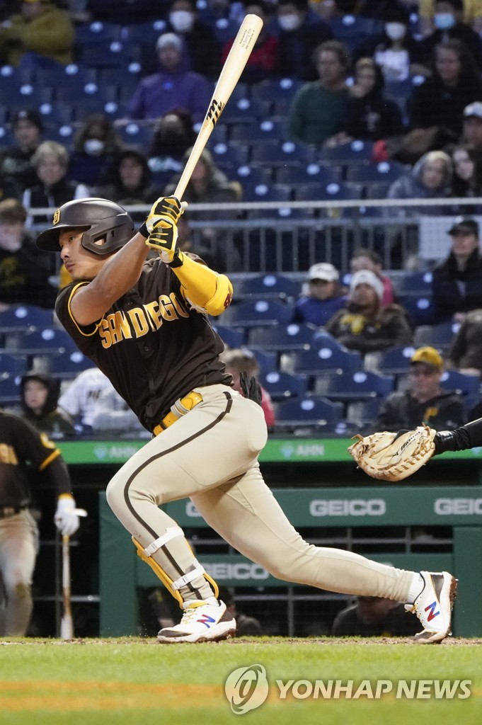 | ▲ In this Associated Press photo, Kim Ha-seong of the San Diego Padres singles against the Pittsburgh Pirates during the top of the fifth inning of a Major League Baseball regular season game at PNC Park in Pittsburgh on April 29, 2022. (Yonhap) |