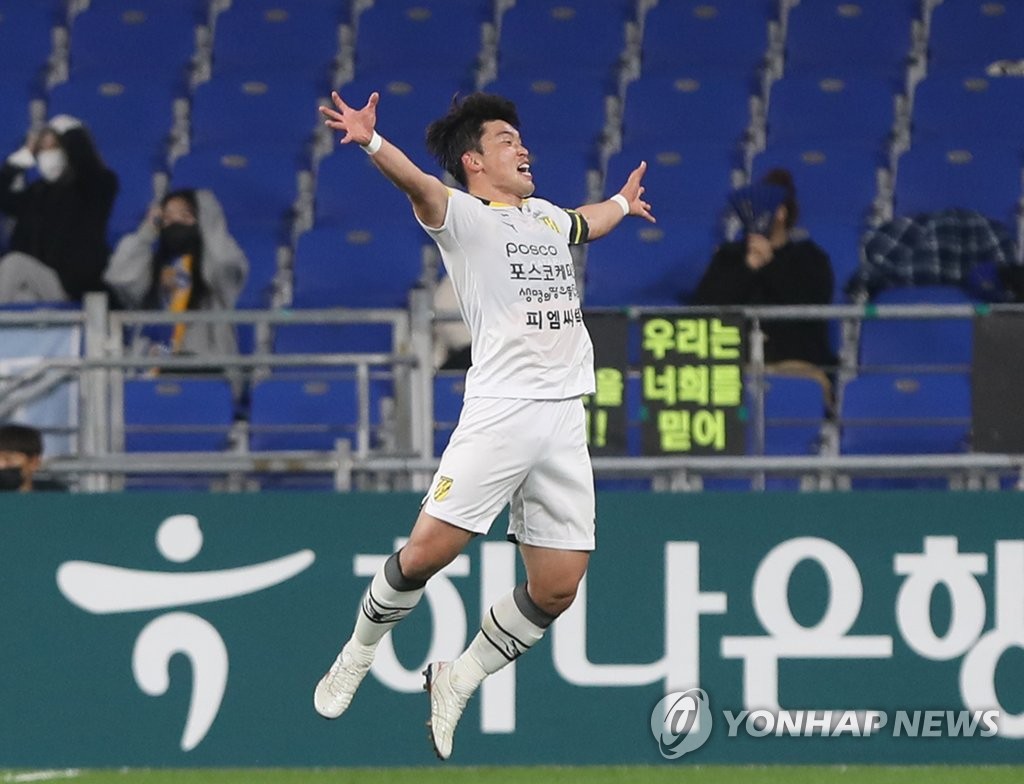 | ▲ In this file photo from Oct. 27, 2021, Lee Jong-ho of Jeonnam Dragons celebrates his goal against Ulsan Hyundai FC in the semifinals of the FA Cup football tournament at Munsu Football Stadium in Ulsan, some 415 kilometers southeast of Seoul. (Yonhap) |