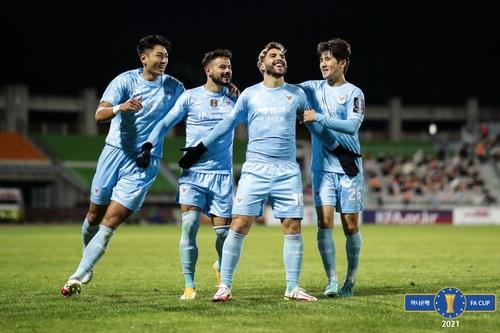 | ▲ In this file photo, provided by the Korea Football Association on Oct. 27, 202, Bruno Lamas of Daegu FC (2nd from R) is congratulated by teammates Jeong Tae-wook, Cesinha and Lee Jin-yong after scoring a goal against Gangwon FC during the semifinals of the FA Cup football tournament at Songam Sports Town in Chuncheon, about 85 kilometers east of Seoul. (PHOTO NOT FOR SALE) (Yonhap) |