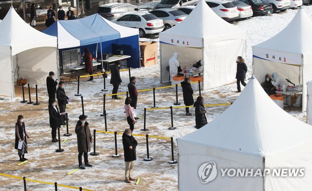| ▲ Visitors wait in line to receive COVID-19 tests at a makeshift clinic in Suwon, south of Seoul, on Jan. 13, 2021. (Yonhap) |