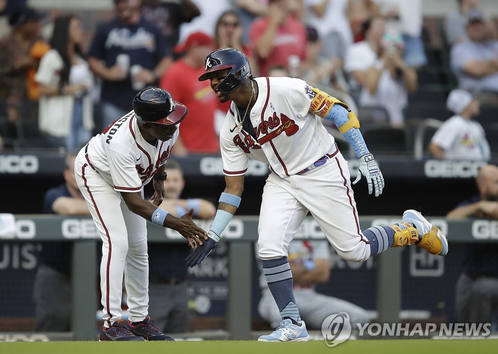 | ▲ 김광현 상대로 홈런친 아쿠냐 주니어 (애틀랜타 AP=연합뉴스) 로날드 아쿠나 주니어가 21일(한국시간) 미국 조지아주 애틀랜타 트루이스트파크에서 열린 세인트루이스 카디널스와의 홈경기에서 김광현을 상대로 개인 통산 100호 홈런을 친 뒤 기뻐하고 있다. |