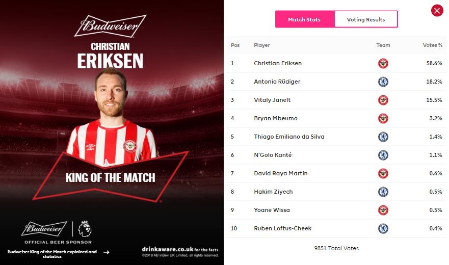 에릭센은 리그 공식 홈페이지에서 팬 투표로 선정되는 '킹 오브 더 매치'(King Of The Match)에도 뽑혔다.