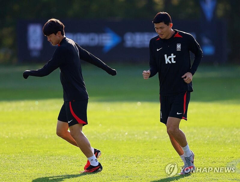 | ▲ 몸 푸는 이재성-김민재 (파주=연합뉴스) 김도훈 기자 = 10일 오후 경기도 파주NFC(축구대표팀 트레이닝센터)에서 열린 한국 축구대표팀 공개훈련에서 대표팀 이재성-김민재가 스트레칭하고 있다. 2023.10.10 superdoo82@yna.co.kr |
