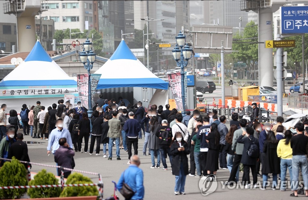| ▲ Citizens wait in a long line to receive virus tests at a makeshift COVID-19 testing clinic in Seoul on May 7, 2021. (Yonhap) |