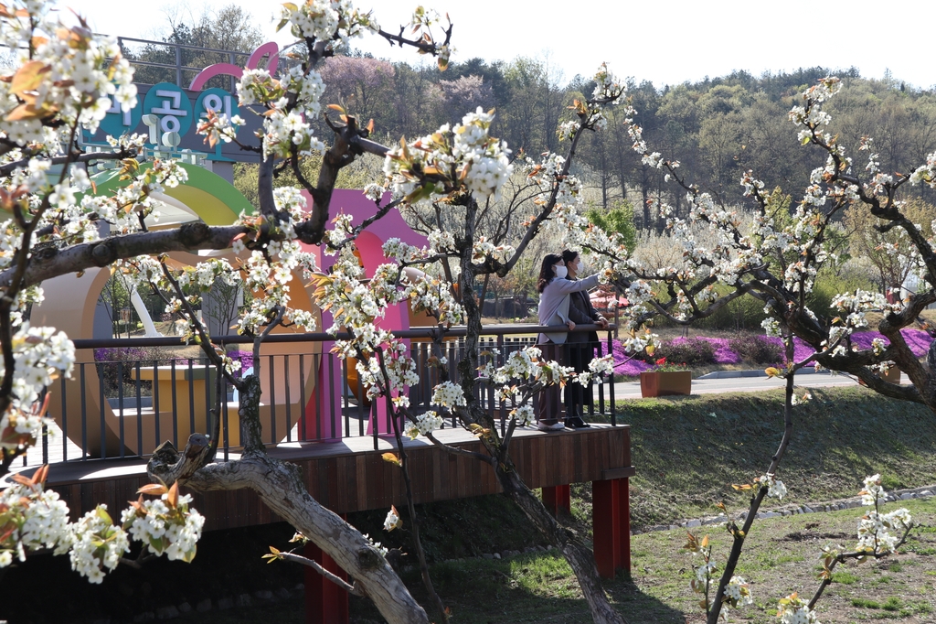 (영동=연합뉴스) 충북 영동군 과일나라테마공원에 있는 100년 묵은 배나무 20그루가 꽃을 활짝 피웠다.