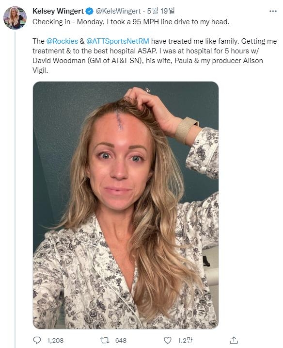 | ▲ 치료받은 사진 소개한 윙거트 리포터 MLB 경기 중 파울 강습 타구를 맞고 쓰러진 미국 방송 리포터 켈시 윙거트가 19일 소셜미디어를 통해 머리를 꿰맨 사진을 소개하고 있다. [윙거트 트위터 캡처. 재배포 및 DB금지] |