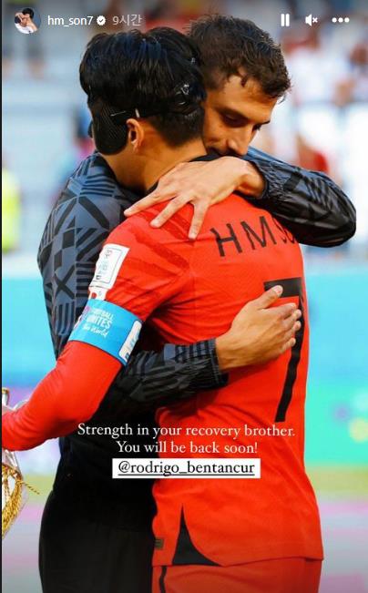 손흥민은 13일(한국시간) 자신의 사회관계망서비스(SNS)에 2022 카타르 월드컵 조별리그 우루과이와 1차전에서 적으로 만난 벤탕쿠르와 포옹하는 사진을 올리고는 "힘내서 회복하기를. 너는 곧 돌아올 거야!"라고 적었다.