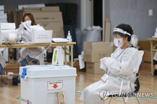 | ▲ Election officials clad in protective gear await COVID-19 patients and those in quarantine at a polling station in Seoul on May 28, 2022, the final day of two-day early voting for the June 1 local elections. (Yonhap) |