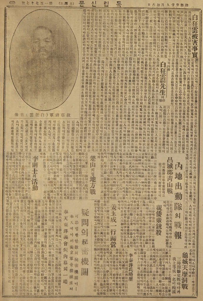 박 교수는 "독립운동사를 연구하는 학자들도 1924년 9월 14일 대한통의부 군인이 주만참의부 본부를 습격해 참의부장 채찬이 희생당한 '남만참변'을 잘 알지 못한다"며 "독립신문 177호 1면에 남만참변과 채찬에 관한 내용이 크게 담겼다"고 설명했다.
