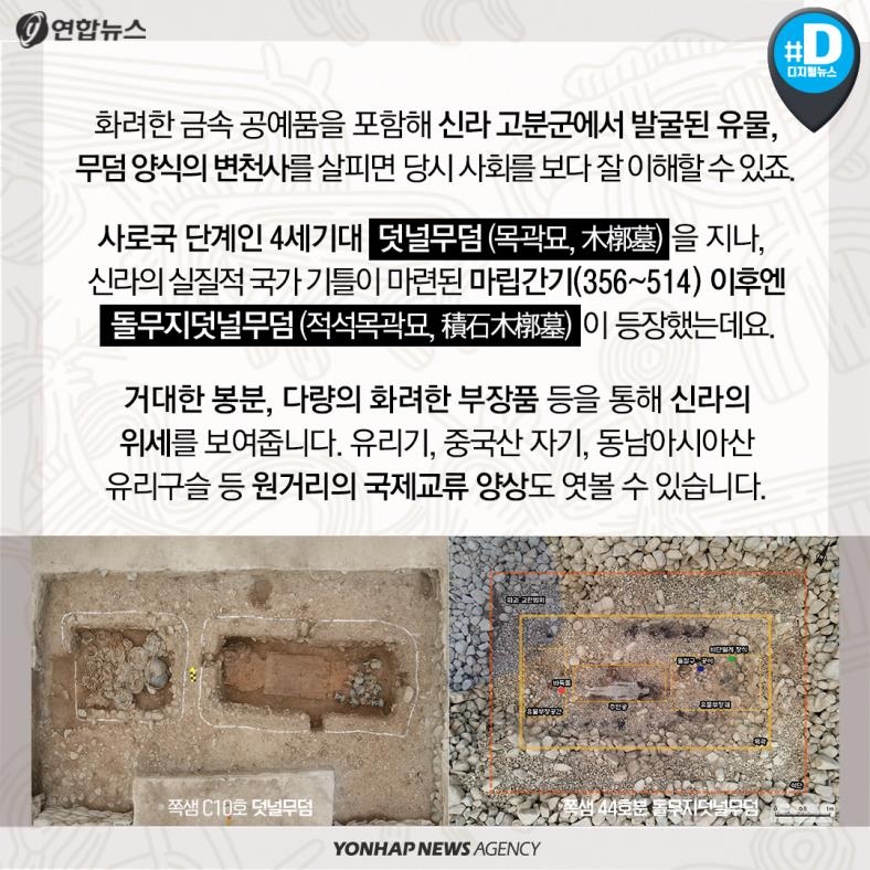 화려한 금속 공예품을 포함해 신라 고분군에서 발굴된 유물, 무덤 양식의 변천사를 살피면 당시 사회를 보다 잘 이해할 수 있죠.
