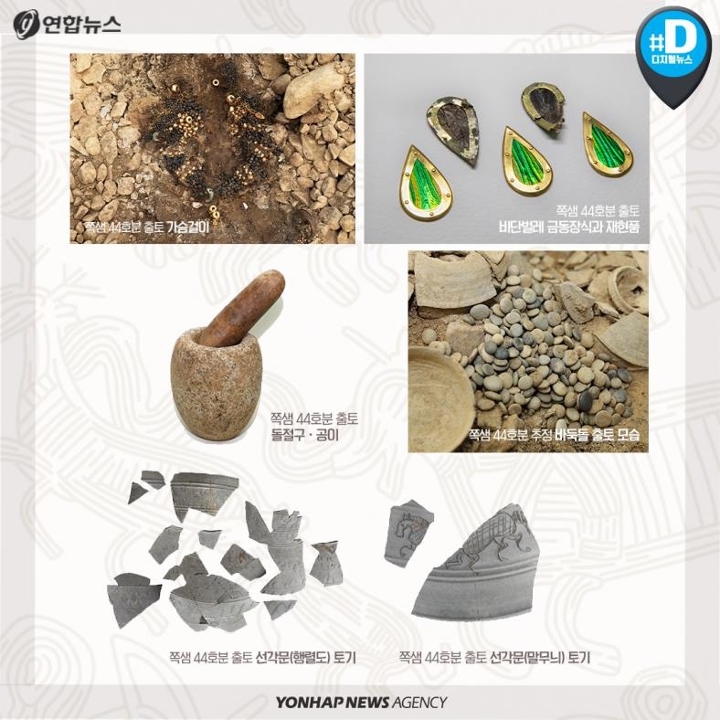 물방울 모양의 비단벌레 금동 장식, 바둑돌과 돌절구, 금구슬·은구슬·옥을 꿰어 만든 가슴 장식 등 출토 유물도 다양합니다.