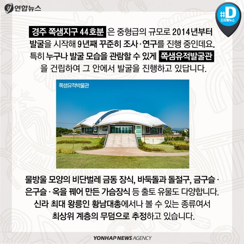 경주 쪽샘지구 44호분은 중형급의 규모로 2014년부터 발굴을 시작해 9년째 꾸준히 조사·연구를 진행 중인데요. 특히 누구나 발굴 모습을 관람할 수 있게 쪽샘유적발굴관을 건립하여 그 안에서 발굴을 진행하고 있답니다.