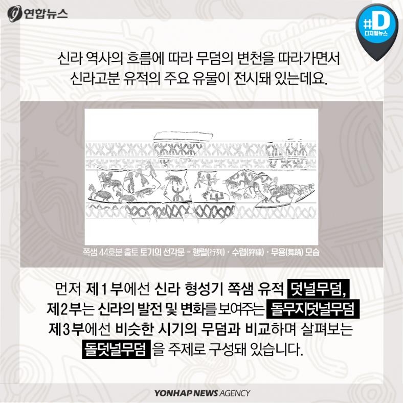 먼저 제1부에선 신라 형성기 쪽샘 유적인 덧널무덤, 제2부에선 신라의 발전 및 변화를 보여주는 돌무지덧널무덤, 제3부에선 비슷한 시기의 무덤과 비교하며 살펴보는 돌덧널무덤을 주제로 구성돼 있습니다.