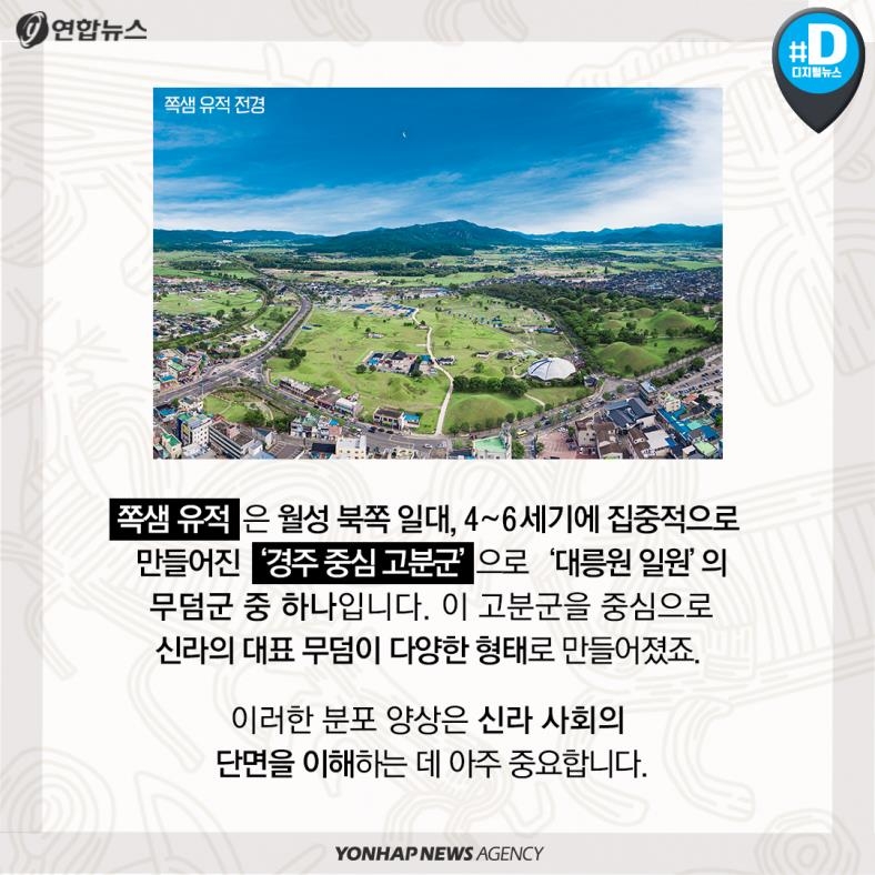 쪽샘 유적은 월성 북쪽 일대, 4~6세기에 집중적으로 만들어진 '경주 중심 고분군'으로 '대릉원 일원'의 무덤군 중 하나입니다. 이 고분군을 중심으로 신라의 대표 무덤이 다양한 형태로 만들어졌죠.
