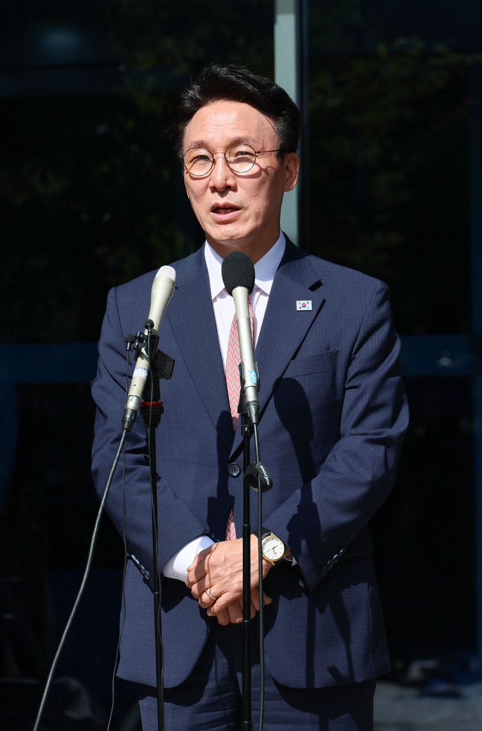 Kim Min-seok, nominated by President Lee Jae-myung as the first prime minister of his government, speaks to reporters as he arrives at a temporary office in Seoul on June 5, 2025, to prepare for his parliamentary confirmation hearing. (Yonhap)