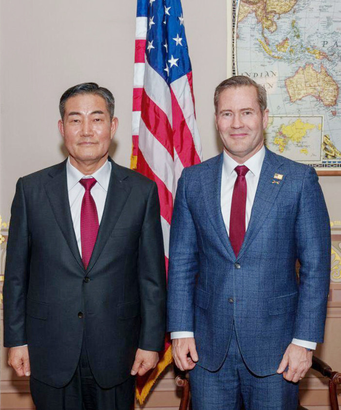 South Korea's National Security Adviser Shin Won-sik (L) poses for a photo with his U.S. counterpart, Mike Waltz, during their first in-person meeting in Washington on March 6, 2025, in this photo released by the South Korean presidential office. (PHOTO NOT FOR SALE) (Yonhap)