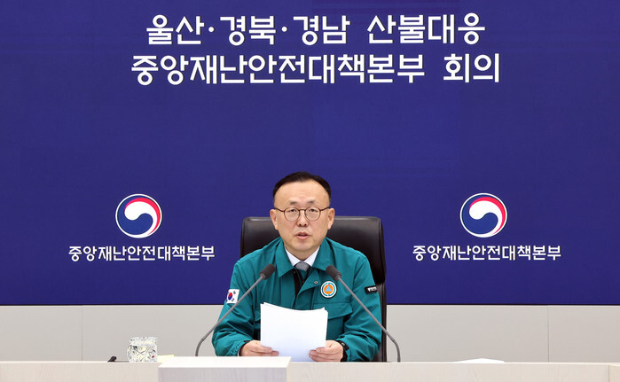 Lee Han-kyung, disaster and safety division chief at the Ministry of the Interior and Safety, attends a meeting of the Central Disaster and Safety Countermeasures Headquarters at the government complex in Sejong, central South Korea, on March 28, 2025, about measures to deal with wildfires in the country's southeastern region. (Yonhap)