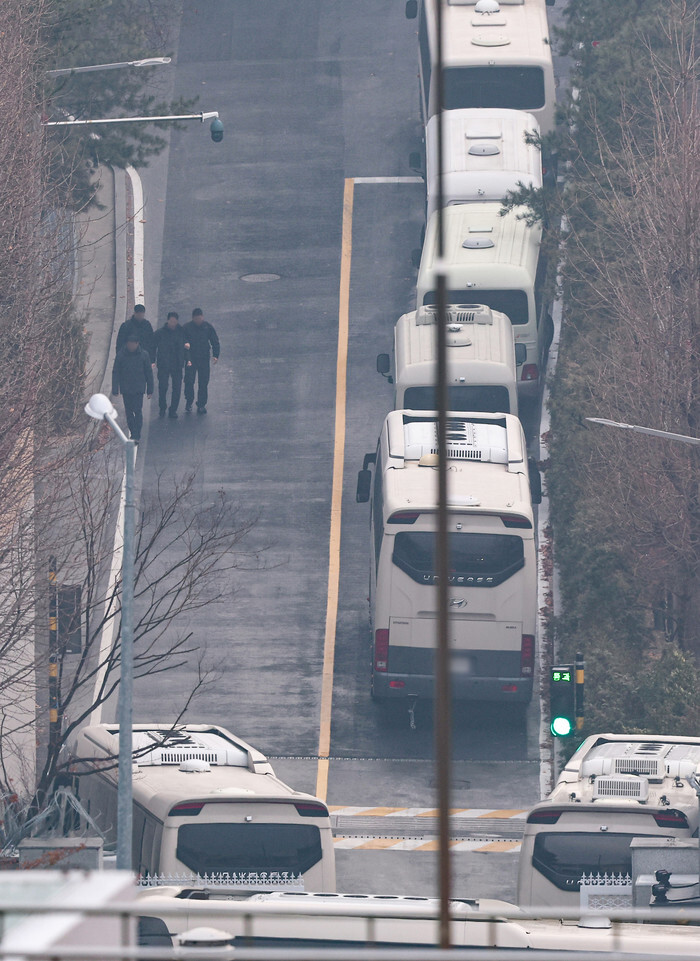 Security guards walk near the entrance of the official residence of impeached President Yoon Suk Yeol in Seoul on Jan. 14, 2025, as investigators led by the Corruption Investigation Office for High-ranking Officials are highly expected to execute a second warrant to detain Yoon in connection to his short-lived imposition of martial law. (Yonhap)