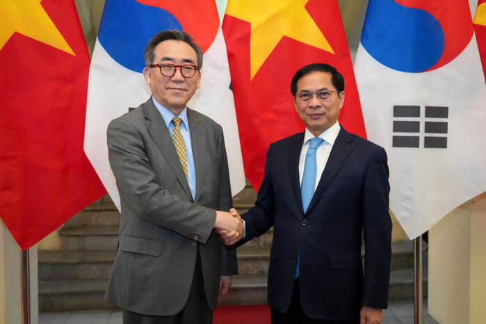 South Korea's Foreign Minister Cho Tae-yul (L) poses for a photo with Vietnam's Deputy Prime Minister and Foreign Minister Bui Thanh Son during their meeting in Hanoi on April 15, 2025, in this photo provided by the foreign ministry in Seoul. (PHOTO NOT FOR SALE) (Yonhap)