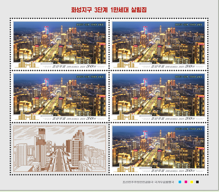 This photo, captured from the website of North Korea's State Stamp Bureau on June 12, 2025, shows stamps featuring the dedication of 10,000 apartments in the third-stage housing section of Pyongyang's Hwasong area in April. (PHOTO NOT FOR SALE) (Yonhap)