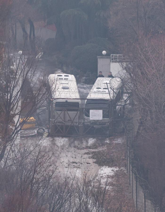 Security guards are seen near a gate of a barbed-wire fence leading to the official residence of impeached President Yoon Suk Yeol in Seoul on Jan. 14, 2025, as investigators led by the Corruption Investigation Office for High-ranking Officials are highly expected to execute a second warrant to detain Yoon in connection to his short-lived imposition of martial law. (Yonhap)