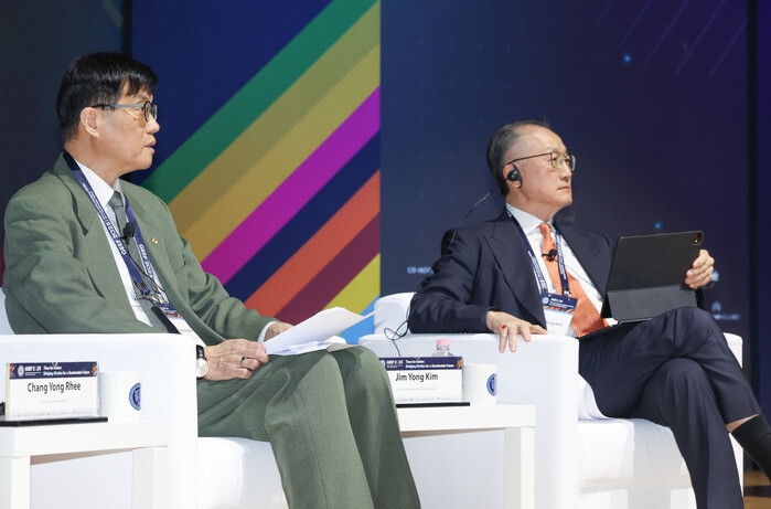 Bank of Korea Gov. Rhee Chang-yong (L), alongside Jim Yong Kim, former president of the World Bank, attends the Global Engagement and Empowerment Forum (GEEF) on Sustainable Development at Yonsei University in Seoul on March 14, 2025. (Yonhap)