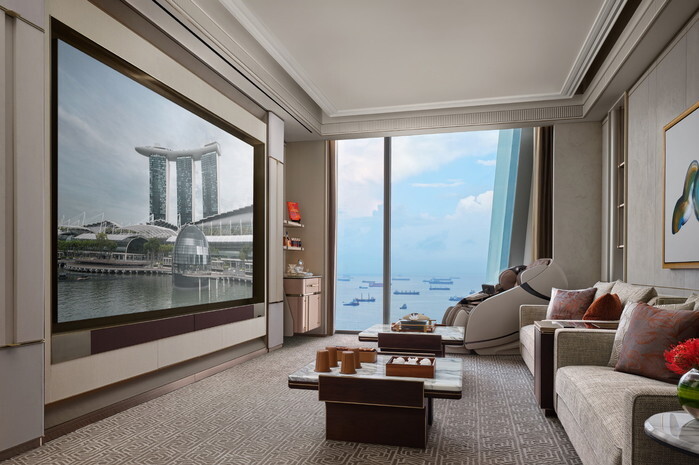 This photo, provided by Samsung Electronics Co. on March 18, 2024, shows the tech giant'smicroLED TV The Wall, recently installed in a suite of Marina Bay Sands in Singapore. (PHOTO NOT FOR SALE) (Yonhap)